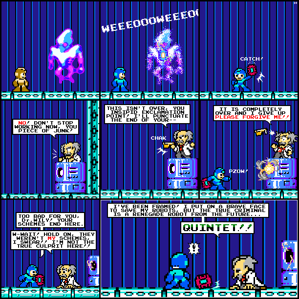 | Dr. Wily just says he's sorry, and that's enough. It pretty squarely establishes Mega Man as brave, but naive to the point of weakness. |
