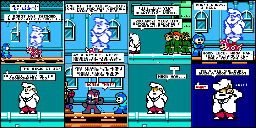 | Mega Man has had robot family, but he hasn't had robot friends before. Dr. Light is so proud. |